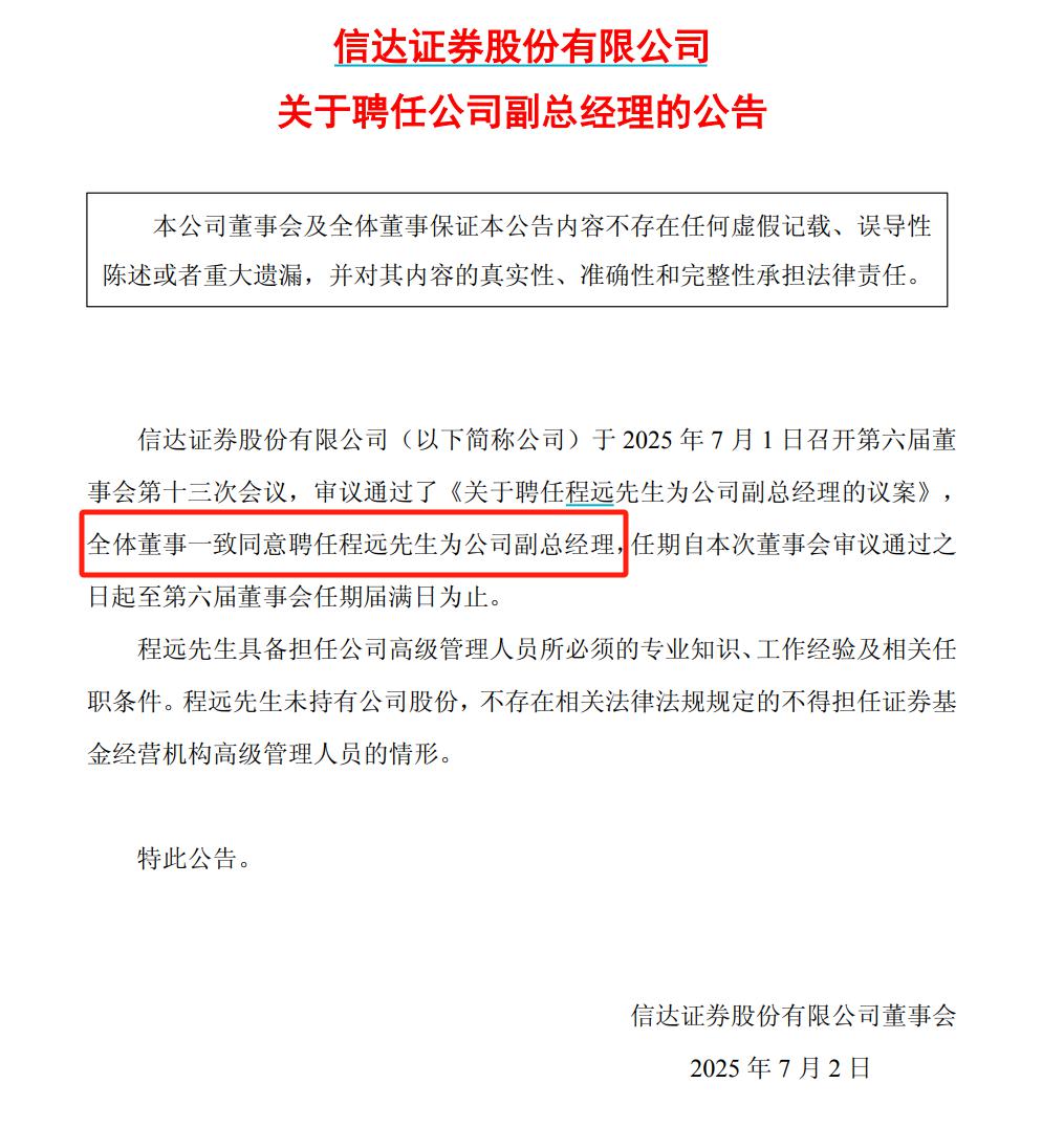 7月1日晚间,信达证券发布公告称,聘任程远为公司副总经理。